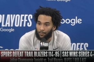 尚帕尼:是的,我们不想再回波特兰了。这算是球队伙计们的共识。我们就是不想再飞回波特兰了,那可是四个小时的航班。所以,在3-1领先并且在主场作战的情况下,你知道,这是一个终结系列赛、不用再去客场的好机会。所以,这就是我们今晚需要的全部动力。